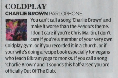 Você não pode nomear uma canção de ‘Charlie Brown’ e torná-la pior do que o tema de Peanuts. Eu não me importo se você é Chris Martin. Eu não me importo se você é um membro da sua própria academia Coldplay, ou se você gravou em uma igreja, ou se a sua esposa está fazendo um livro de receitas especialmente para vegans que ensinam yoga Bikram aos monges. Se você nomear uma canção ‘Charlie Brown’ e soar malfeito você está oficialmente fora do clube.
