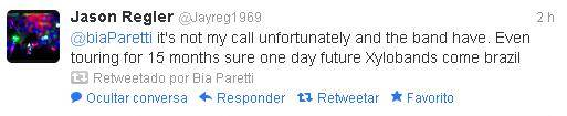 [ATUALIZADO] Jason Regler respondeu uma fã brasileira sobre a vinda do Coldplay no país: “Não posso fazer muito infelizmente e a banda tem feito a mesma turnê durante 15 meses, com certeza no futuro as Xylobands chegarão ao Brazil.”