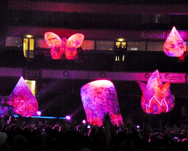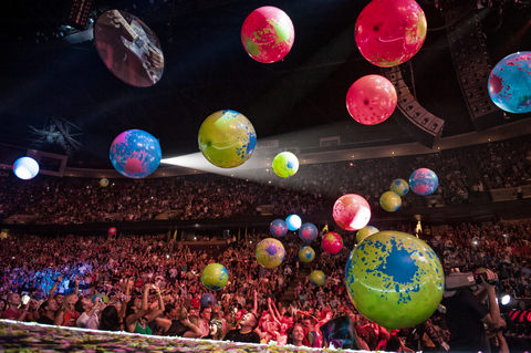 Outra coisa que não podia faltar são os balões. Logo que a banda começa a tocar Yellow, para a alegria do público balões amarelos despencavam do céu, a única modificação aqui foram as cores…