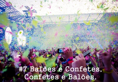 Já é marca registrada dos shows o espetáculo visual causado pelos incríveis confetes temáticos do Coldplay. Muita gente ficou triste com a retirada de Lovers in Japan e seus confetes borboletas :borboleta: do setlist. Alguém da produção pensou “hey, não podemos ficar sem os confetes”, no início a substituição aconteceu na música In My Place, com confetes da letra M e X, somente depois começaram a entrar outros tipos. Se o vento for bonzinho com você, durante o show é possível pegar vários no ar, caso contrário, terá que esperar o show terminar e pegar alguns do chão…mas saiba que fazer isso é bastante divertido.