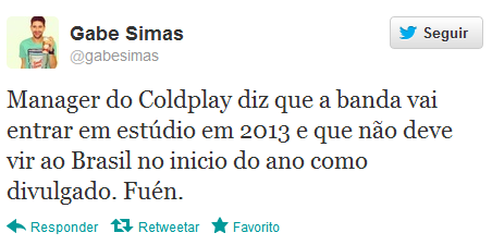Conhecido por informar com antecedência as datas de shows aqui no Brasil, foi ele quem acertou a vinda do Coldplay no Rock in Rio em 2011. Porém, esse rumor entra em contradição com a recente informação de que Chris Martin iria se mudar para Los Angeles. Outro fato, é de que a banda sempre deixa um considerável espaço de tempo para a produção de um novo álbum, Parachutes (2000), A Rush of Blood to the Head (2002), X&Y (2005), Viva la Vida or Death and All His Friends (2008) e Mylo Xyloto (2011). Portanto, não vamos tirar conclusões, até que a banda faça algum anúncio da turnê na America Latina no site oficial.