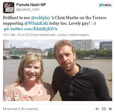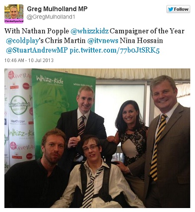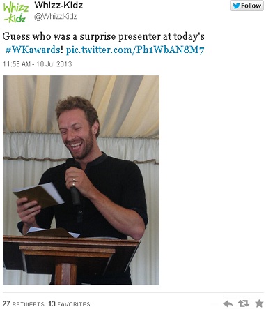 Como vocês já devem ter conferido no twitter oficial do Coldplay, na última quarta-feira Chris e Phil Harvey (o “quinto integrante” da banda) marcaram presença no evento beneficente “Whizz Kids Awards”, que ocorreu em Londres no dia 10 de Julho, mesmo dia em que o álbum Parachutes comemorou o aniversário de 13 anos de seu lançamento. Autoridades e convidados foram surpreendidos com a presença do vocalista do Coldplay que demonstrou, ao concordar em apresentar um dos ganhadores, engajamento e sensibilidade com as crianças. O que não é novidade, já que Martin frequentemente se envolve em causas sociais. A premiação foi realizada na “House of Commons”, espaço que integra o Parlamento Inglês, e contou com um breve discurso do primeiro ministro David Cameron. Clique em “Leia mais” para ver detalhes e fotos do evento.